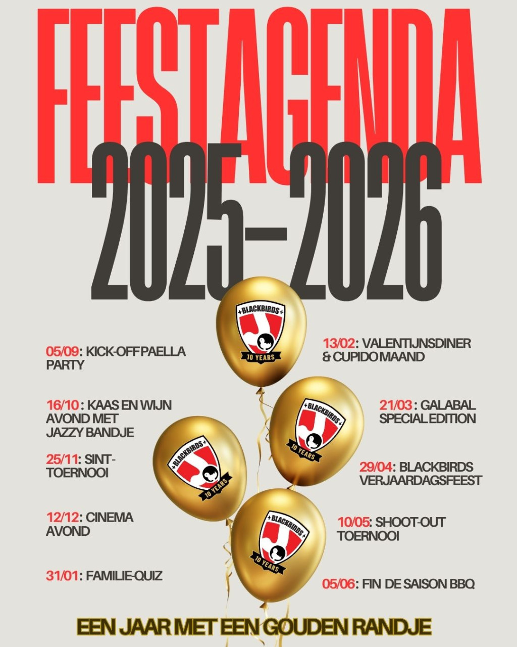 We bestaan dit jaar 10 jaar en dat moet uiteraard gevierd worden! We hebben voor iedere maand een leuke activiteit opstaan en maart staat volledig in teken van het Galabal! En dit jaar wordt het er eentje met een gouden randje :-) Wij nodigen jullie van harte uit om op zaterdag 21 maart met ons mee te komen schitteren in Domein Martinus te Halle-Zoersel. Er zijn verschillende formules mogelijk (diner+dansfeest of alleen dansfeest/als particulier of zakelijk) en ook onze U19tjes zijn meer dan welkom! Speciaal voor hen hebben we een voordeligere formule zodat ze mee kunnen genieten van al het lekkere eten en het dansfeest. Wil je meer weten? Via deze link vind je meer info (particulier) of info (zakelijk). Of heb je vragen, mail naar voorzitter@hcblackbirds.be We gaan er weer een zaaaalige avond van maken!!